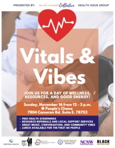 This Sunday, the Black Leaders Collective (BLC) Health Issue Group and community partners will bring the community together for Vitals & Vibes—a day centered on wellness, connection, and collective care for Austin families. BLC continues to lead meaningful, community-driven efforts that strengthen health and opportunity across our city.